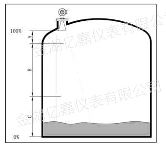2介質(zhì)為低介電常數(shù)當(dāng)其處于低液位時(shí),罐低可見,此時(shí)為保證測(cè)量精度,建議將零點(diǎn)定在低高度為C 的位置。
